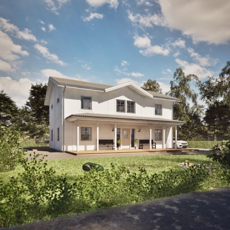 Kungsholm är ett symmetriskt hus med lantlig karaktär. Den verandaförsedda entrén med pelare ger ett lyxigt och välkomnande intryck. På baksidan skapar en vinkelbyggnad ett vardagsrum med ljus från tre håll. Köket har öppen planlösning med köksö och matsalsdel som har utgång till trädgården. Entréplanet rymmer även ett arbetsrum/sovrum med klädkammare, badrum och tvättavdelning med egen ingång. På övervåningen binds föräldrasovrummet och två barnsovrum med klädkammare samman av ett allrum och ett gemensamt badrum.