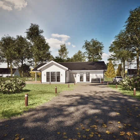 Sandhem har sällskapsytor mot entrésidan och sovrum mot träd- gården. Till höger om entréns pardörrar ligger köket med mat- plats, och åt andra hållet ett rymligt vardagsrum med stora föns- ter och utgång till trädgården. Ett sovrum och vardagsrummet har dubbeldörrar till den takinklädda terrassen. Föräldrasovrum- met har egen wc/dusch och klädkammare. Ytterligare två sovrum, badrum och tvättavdelning med groventré kompletterar huset. Perfekt för söderläge mot gatan.